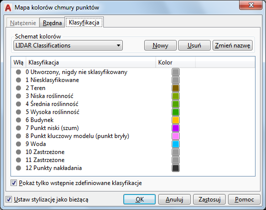 Stylizacje Natężenie, Poziom i Klasyfikacja kolorują chmurę punktów na podstawie odpowiednich danych punktów należących do chmury. Można wybrać wstępnie zdefiniowane schematy kolorów, takie jak „Zakres” lub „Ziemia”, albo utworzyć własne schematy. Do stylizacji Natężenie i Poziom można przypisać ten sam schemat kolorów albo różne schematy. Stylizacja Klasyfikacja ma odrębny zestaw schematów.