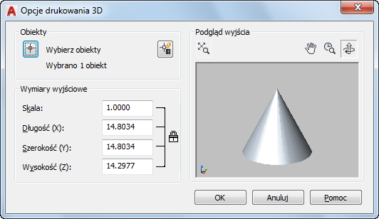Podczas korzystania z poleceń DRUKUJ3D i USŁUGADRUKU3D jest wyświetlane okno dialogowe Opcje drukowania 3D. Można wyświetlić podgląd i zmienić rozmiar lub określić skalę wydruku bez wpływu na ogólne proporcje.