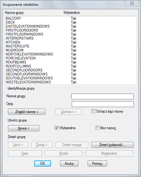 Tworzy nową grupę z wybranych obiektów, wykorzystując nazwy i opisy z pola Nazwa grupy i Opis.
