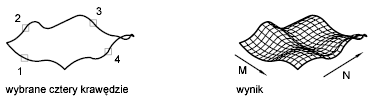 Siatka na poniższej ilustracji została uzyskana z czterech obiektów nazywanych krawędziami. Krawędzie mogą być łukami, liniami, poliliniami, splajnami lub łukami eliptycznymi, które tworzą zamkniętą pętlę o wspólnych końcach. Płat Coonsa jest powierzchnią bikubiczną (jedna krzywa w kierunku M i jedna w kierunku N), interpolowaną między dwiema krawędziami.