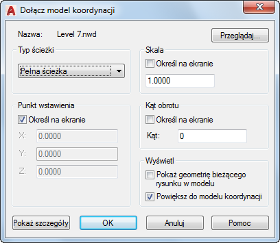 Określa sposób znalezienia i wczytania pliku modelu koordynacji: Pełna ścieżka (bezwzględna), ścieżka Względna (do rysunku głównego), Brak ścieżki (plik znajduje się w tym samym folderze, co rysunek główny). Domyślny typ ścieżki to ścieżka względna. Użyj REFPATHTYPE zmienna systemowa służąca do zmiany domyślnego typu ścieżki.