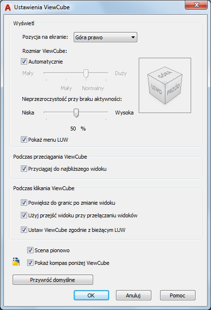 Stosuje domyślne ustawienia narzędzia ViewCube.