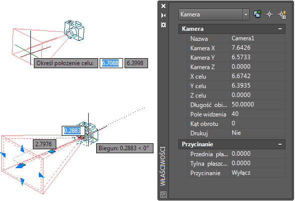 Można zmodyfikować długość obiektywu kamery, zmienić jej przednią i tylną płaszczyznę tnącą, nadać jej nazwę oraz włączyć lub wyłączyć obraz wszystkich kamer na rysunku.