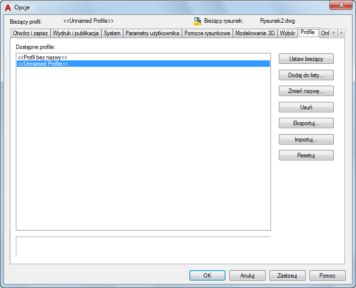 Importuje profil (plik z rozszerzeniem .arg) utworzony za pomocą opcji Eksportuj.