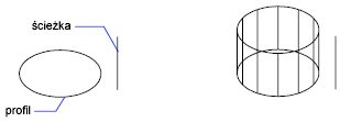 Umożliwia określenie ścieżki wyciągania w oparciu o wybrany obiekt. Ścieżka zostanie przeniesiona do środka ciężkości profilu. Następnie profil zaznaczonego obiektu zostanie wyciągnięty wzdłuż wybranej ścieżki, aby utworzyć z niego bryły lub powierzchnie.