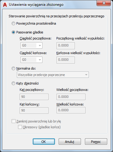 Umożliwia utworzenie gładkiej, zamkniętej powierzchni, w której szwie nie będą powstawały punkty podziału w przypadku zmiany jego kształtu. Ta opcja jest dostępna tylko, jeśli wyciągnięcie złożone będzie prostokreślne lub gładko dopasowane i zostanie wybrana opcja Zamknij powierzchnię lub bryłę.