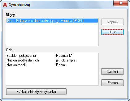 W oknie dialogowym Synchronizuj można wyświetlić listę wykrytych błędów. Niektóre błędy (na przykład nieodpowiednia wielkość kolumny w tabeli źródłowej) mogą być naprawiane bezpośrednio w oknie dialogowym Synchronizuj. Inne błędy (na przykład wskazanie nieistniejącego rekordu) muszą być usuwane w źródłowej tabeli bazy danych.