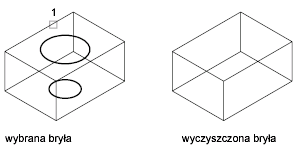 Usuwa wspólne krawędzie lub wierzchołki należące do tej samej powierzchni lub definicji krzywej po dowolnej stronie krawędzi lub wierzchołka. Usuwa wszystkie powtarzające się krawędzie, wierzchołki i nieużywane geometrie. Nie usuwa odciśniętych krawędzi.