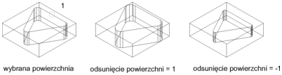 Odsuwa równomiernie powierzchnię o określoną odległość lub przez określony punkt. Wprowadzenie wartości dodatniej powoduje zwiększenie rozmiaru lub objętości bryły. Określ wartość ujemną, aby zmniejszyć rozmiar lub objętość bryły.