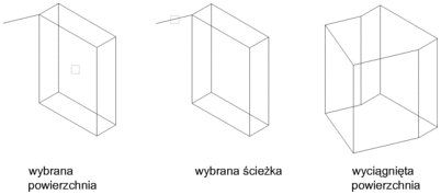 Ustala linię lub krzywą definiującą ścieżkę wyciągnięcia. Wszystkie profile wybranej powierzchni zostają wyciągnięte według wybranej ścieżki, tworząc wyciągnięcie proste.