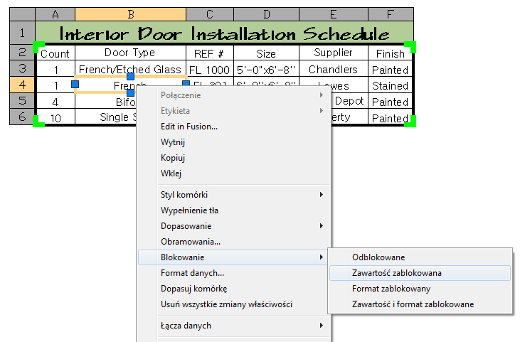 Domyślnie wszystkie komórki w tabeli wyodrębniania danych są zablokowane do edycji i odblokowane do zmian formatowania. Można odblokowywać i blokować komórki do formatowania i edytowania za pośrednictwem menu skrótów tabeli.