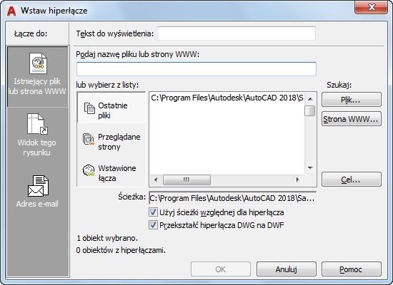 Wyświetla ścieżkę do pliku skojarzonego z hiperłączem. Jeśli wybrano opcję Użyj ścieżki względnej dla hiperłącza, na liście pojawia się tylko nazwa pliku. Jeżeli nie wybrano opcji Użyj ścieżki względnej dla hiperłącza, wyświetlana jest pełna ścieżka oraz nazwa pliku.