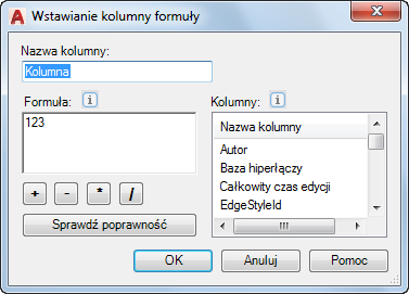 Sprawdza poprawność określonego równania. Kolumnę formuły można wstawić tylko wtedy, gdy zostanie sprawdzona poprawność formuły.