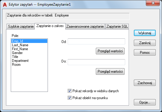 Otwiera okno dialogowe Opcje widoku danych i zapytania.
