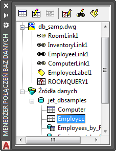 Zawiera węzły dla wszystkich rysunków otwartych w danej chwili oraz węzeł Źródła danych, który zawiera wszystkie dostępne źródła danych skonfigurowane w systemie.