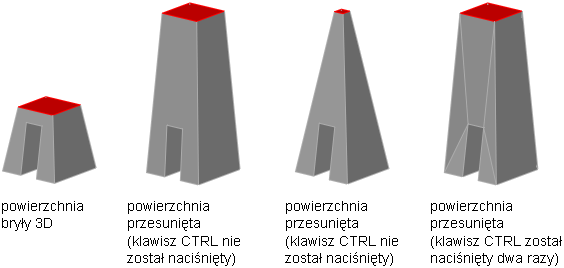 - Przesunięcie powierzchniJeśli w przypadku operacji przesuwania powierzchni klawisz Ctrl zostanie naciśnięty jeden raz i puszczony, rozmiar powierzchni zostanie zmodyfikowany w zakresie obwiedni lub obrysu przyległych powierzchni.