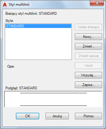 Zmienia nazwę aktualnie wybranego stylu multilinii. Nie można zmienić nazwy stylu multilinii STANDARD.