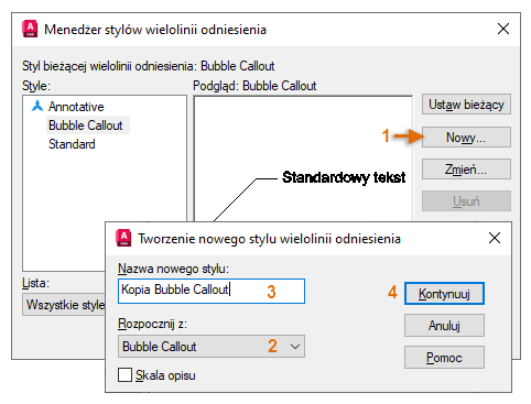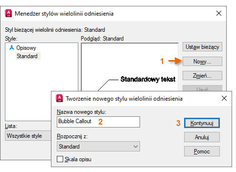 W Menedżerze stylów wielolinii odniesienia kliknij przycisk Nowy (1), nadaj nowemu stylowi nazwę Objaśnienie typu chmurka (2) i kliknij przycisk Kontynuuj (3).