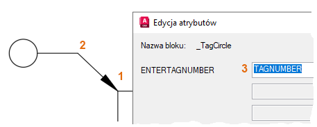 Korzystając z trybu lokalizacji względem obiektu Punkt końcowy, kliknij róg prostokąta, aby określić położenie grotu strzałki (1). Następnie kliknij miejsce docelowe linii odniesienia (2), wpisz literę lub cyfrę w oknie dialogowym Edycja atrybutów (3) i kliknij przycisk OK.