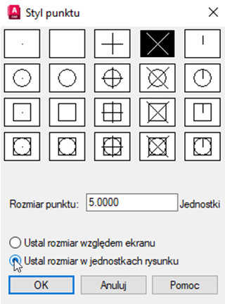 Na początek chcemy, by obiekty punktów były lepiej widoczne. Zmienimy styl punktu za pomocą polecenia PTYPE, które ustawia styl i rozmiar wszystkich obiektów punktów na rysunku. Nie jest to konieczne, lecz jeśli tego nie zrobimy, utworzone punkty będą tylko pojedynczym pikselem, który może być trudny do zauważenia.
