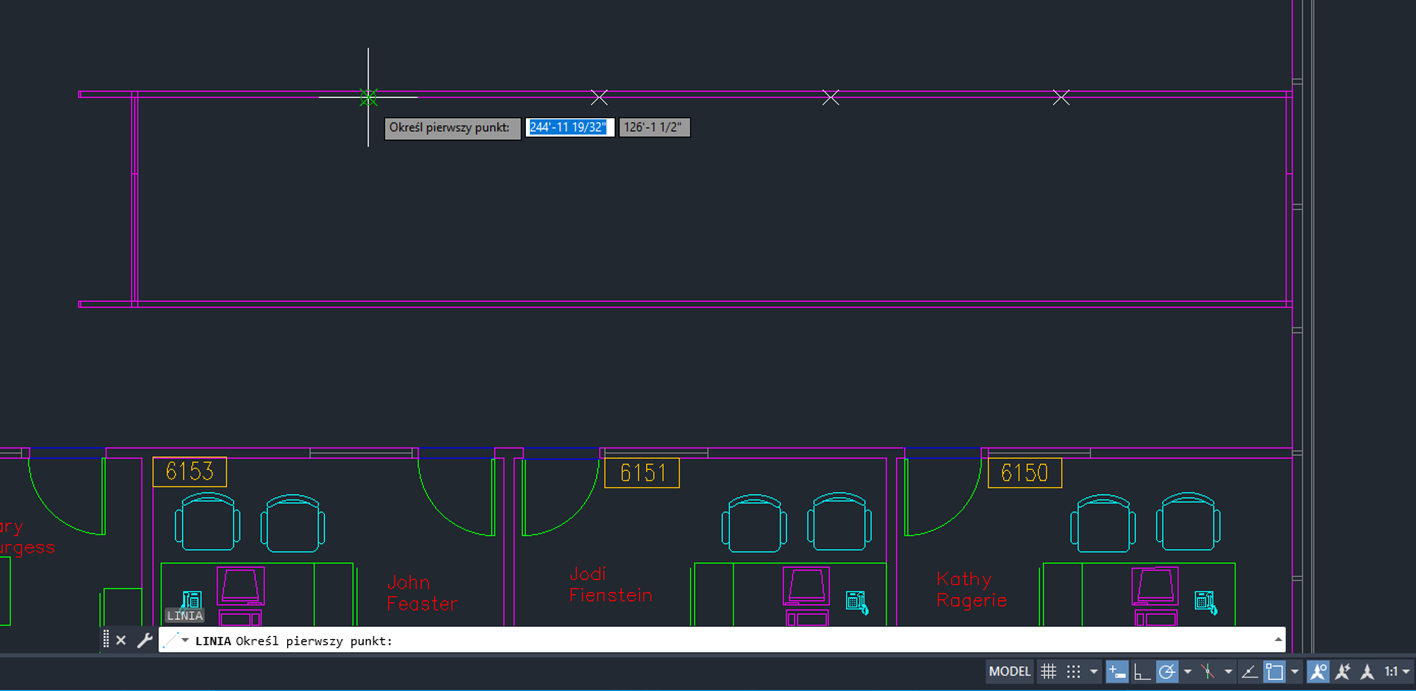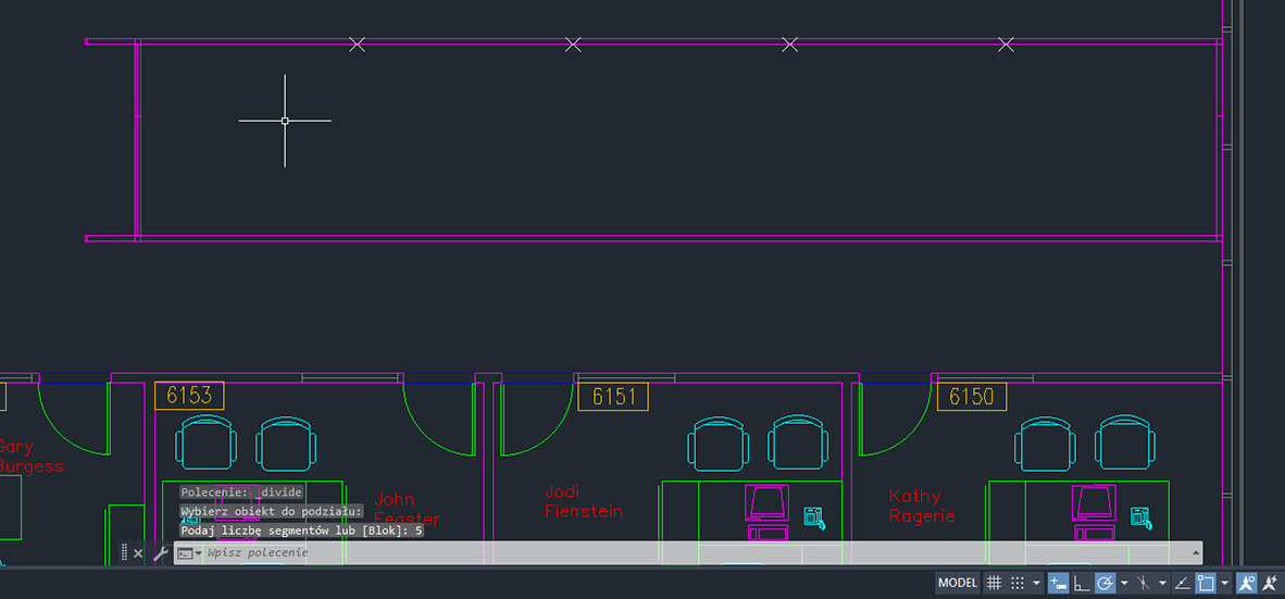 Załóżmy, że chcemy dodać ściany, aby utworzyć między nimi pięć boksów biurowych w pustej przestrzeni. W celu samodzielnego odtworzenia tego ćwiczenia możesz użyć przykładowego rysunku Floor Plan Sample.DWG i usunąć boksy od 6156 do 6162 lub utworzyć nowy rysunek i po prostu narysować prostokąt o podobnym kształcie przedstawiający ściany biurowe.