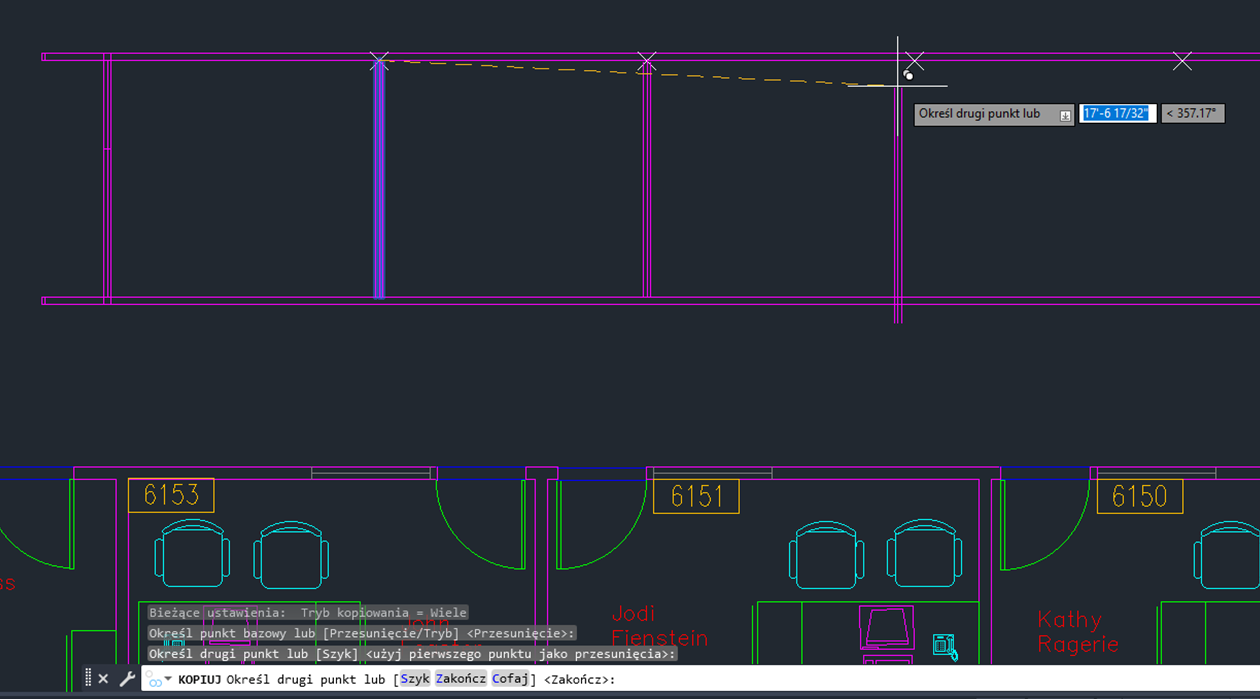 Teraz możemy łatwo określić, gdzie powinny się znaleźć ściany. Użyj polecenia LINIA, aby utworzyć ścianę, a następnie polecenia KOPIUJ, aby powielić ścianę, w której znajdują się poszczególne punkty.