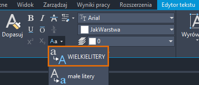 Można zauważyć, że w większości rysunków tekst jest zazwyczaj pisany wielkimi literami. W wielu branżach, takich jak inżynieria i architektura, standardem jest zapisywanie notatek wielkimi literami. Dlatego też, aby automatycznie przekształcić cały nowy i importowany tekst na wielkie litery, wykonaj jedną z następujących czynności: