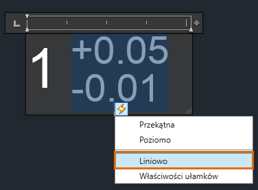Aby utworzyć stos tolerancji, wprowadź znak numeryczny przed i za symbolem daszka (^). Wpisz na przykład 1 +0,05^-0,01, a następnie naciśnij klawisz spacji.