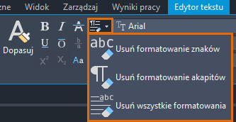 Na karcie kontekstowej wstążki Edytor tekstu, na panelu Formatowanie, kliknij przycisk Wyczyść i wybierz jedną z następujących opcji: