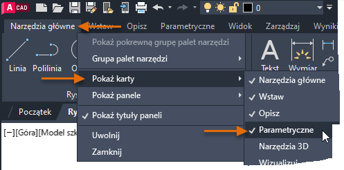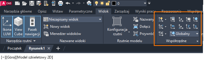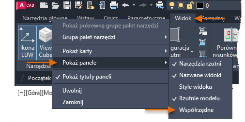 W tym ćwiczeniu zostaną ukryte karty wstążki Parametryczne i zostanie wyświetlony panel Współrzędne na karcie Widok.