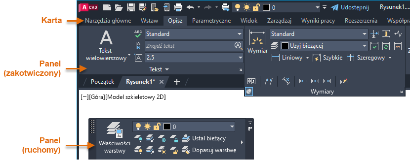 Panele na karcie wstążki można uwalniać w oknie aplikacji. Uwolniony panel wstążki pozostaje widoczny bez względu na to, która karta wstążki jest aktywna. To przydatna funkcja w przypadku częstego przełączania między kilkoma różnymi typami narzędzi. Można na przykład uwolnić panele Warstwy i Właściwości, tak aby były one widoczne nawet przy aktywnych kartach Wstaw lub Opis.