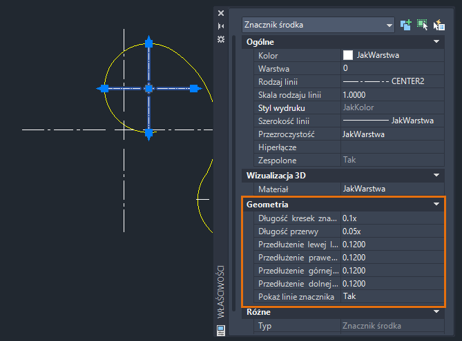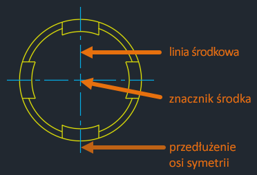 | CENTERLTYPE | Określa rodzaj linii używanych przez znaczniki środka i osie symetrii. | „CENTER2” | Rysunek |