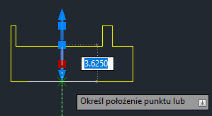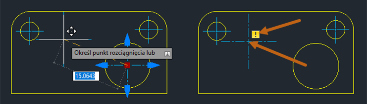 Znaczniki środka i linie środkowe można również edytować przy użyciu uchwytów. Wskazanie uchwytu kursorem spowoduje wyświetlenie wymiarów dynamicznych linii pomocniczej.