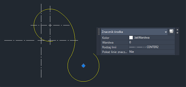 | ZNACZNIKŚRODKA | Tworzy zespolony znacznik krzyżowy w środku wybranego okręgu lub łuku. |