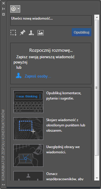Paleta komunikatora zespołu konstruktorów umożliwia udzielanie za pośrednictwem usługi Autodesk 360 odpowiedzi współpracownikom i klientom na komunikaty, które mogą zawierać dołączone obrazy. Komunikaty mogą być połączone z położeniami i obszarami na rysunku, a dostęp do nich mogą uzyskać upoważnione osoby w trybie online.