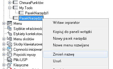 Zostanie utworzony nowy pasek narzędzi (o nazwie Paseknarzędzi1), a nowy przycisk rozwijany odwołujący się niego zostanie umieszczony na dole wybranego paska narzędzi.