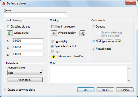 Określa obiekty, które mają być włączone do powstającego bloku, oraz wskazuje, czy po jego utworzeniu mają być one pozostawione, usunięte czy przekonwertowane na wystąpienia bloku.