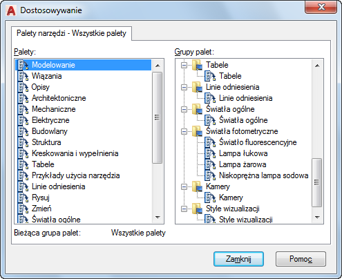 Wyświetla listę wszystkich dostępnych palet narzędzi.