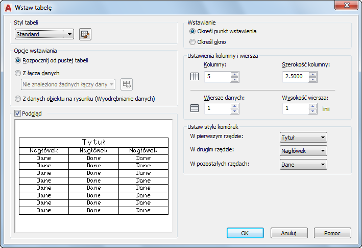 Z bieżącego rysunku należy wybrać styl tabeli, który posłuży do utworzenia tabeli. Nowy styl tabeli można utworzyć, klikając przycisk obok listy rozwijanej.