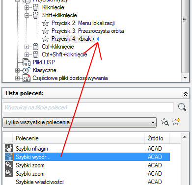 W panelu Lista poleceń przeciągnij polecenie, które chcesz dodać do przycisku myszy w panelu Dostosowywanie w