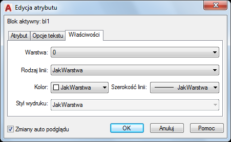 Określa, czy obszar rysunku jest natychmiast aktualizowany w celu wyświetlenia wprowadzonych zmian widocznych atrybutów. Jeżeli opcja Automatyczny podgląd zmian jest zaznaczona, zmiany są natychmiast widoczne. Jeżeli opcja Automatyczny podgląd zmian nie jest zaznaczona, zmiany nie są pokazywane.
