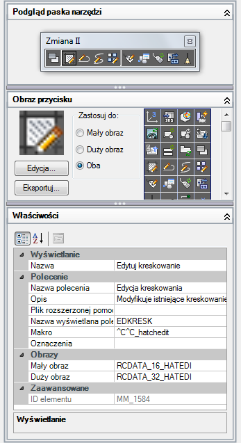 Panel Wyświetlanie dynamiczne zawiera podgląd elementu interfejsu użytkownika na panelu Dostosowywane pliki. Umożliwia edycję obrazu polecenia wybranego na panelu Lista poleceń oraz właściwości charakterystycznych dla elementu wybranego na panelu Dostosowywane pliki lub na panelu Lista poleceń.