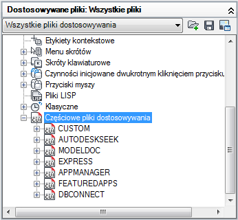 W tym panelu można tworzyć i modyfikować elementy interfejsu użytkownika, takie jak karty i panele wstążki oraz pasek narzędzi szybkiego dostępu. Wzdłuż górnej krawędzi panelu znajdują się narzędzia, które mogą być używane do wczytywania częściowych plików adaptacji do głównego pliku adaptacji, zapisywania zmian we wczytanych plikach adaptacji oraz sterowania sposobem wyświetlania wczytanych plików adaptacji.
