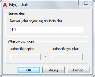 Podaj nazwę opisową lub liczbową. Na przykład w rysunku architekturalnym z typową skalą calową można podać 1”=4’ lub 1:48.