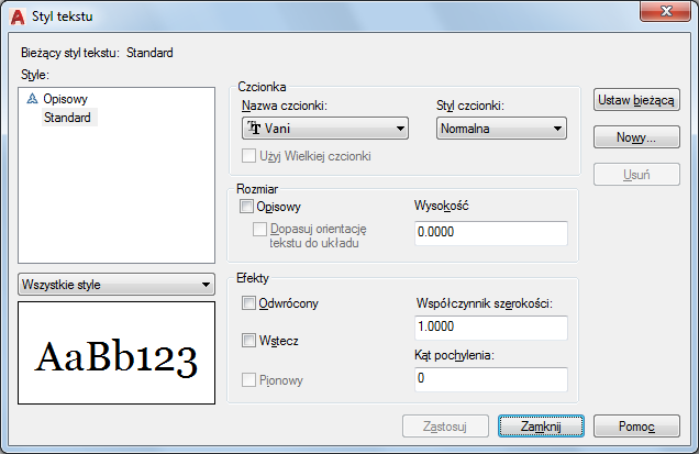 Określa format znaku czcionki, taki jak kursywa, pogrubienie, lub podkreślenie. Wybranie opcji Użyj Big Font powoduje zmianę tej opcji na Nazwa Big Font, która jest używana do wybrania nazwy pliku czcionki Big Font.
