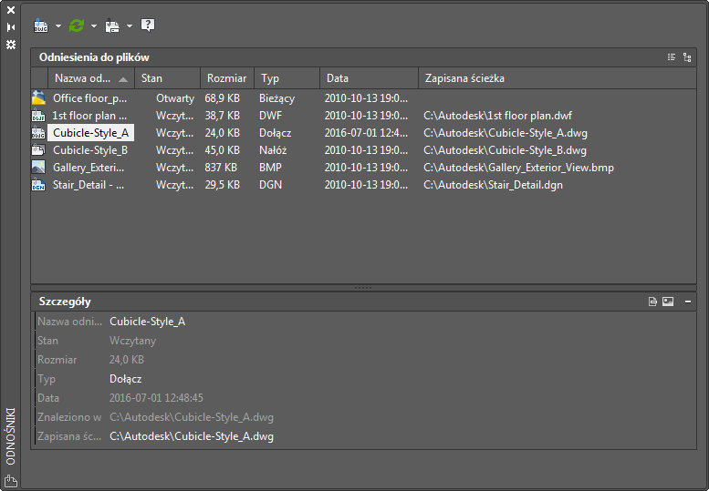 - Wyświetla listę odniesień w bieżącym rysunku, w tym takie informacje jak stan, rozmiar i data utworzenia pliku.