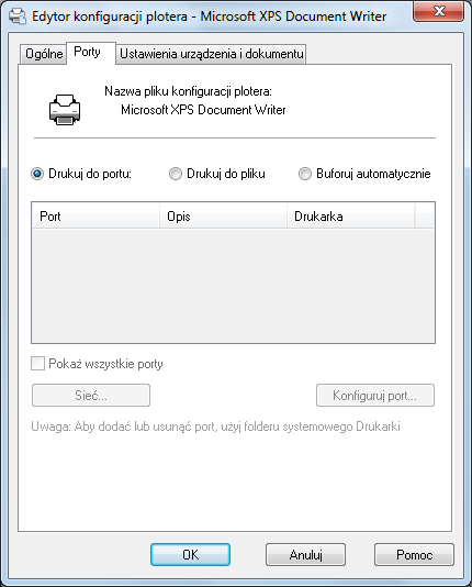 Wyświetla listę i opisy dostępnych portów lokalnych i sieciowych. Jeżeli port jest portem sieciowym, wyświetlana jest także nazwa drukarki sieciowej.