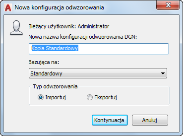 Otwiera okno dialogowe Zmień konfigurację odwzorowania DGN. W zależności od wybranego typu odwzorowania (Import lub Eksport) jest otwierane odpowiednie okno dialogowe importu/eksportu.