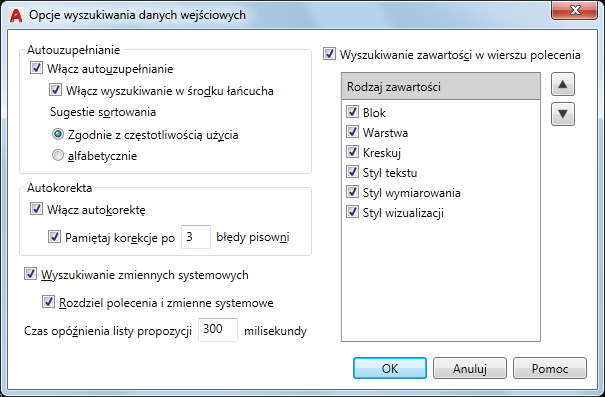 Steruje ustawieniami wyświetlania listy propozycji poleceń, zmiennych systemowych i nazwanej zawartości, takiej jak bloki i warstwy.