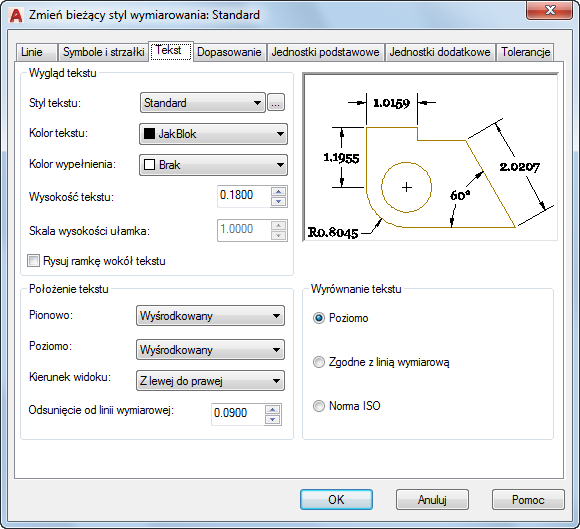 Jeśli styl tekstu określony na tej karcie posiada stałą wysokość tekstu, zastąpi ona wprowadzoną tutaj wartość wysokości tekstu. Jeśli wysokość tekstu wymiaru ma być ustawiona tutaj, należy się upewnić, że wysokość dla stylu tekstu jest ustawiona na 0. Więcej informacji na temat ustawiania wysokości tekstu dla stylów tekstu można znaleźć w opisie polecenia STYL.